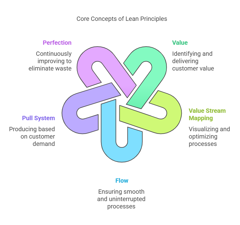 Lean principles, originating from the Toyota Production System, emphasize the elimination of waste and the continuous improvement of processes. The core concepts include: